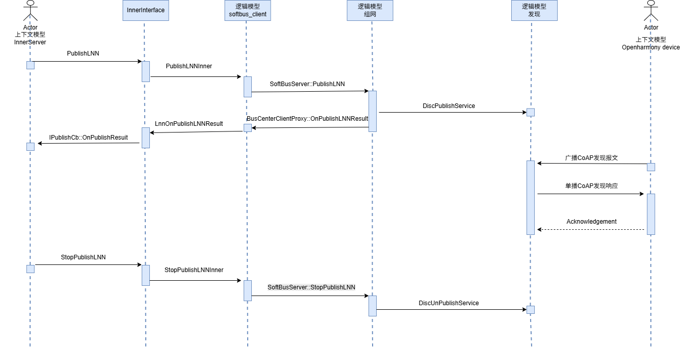CoAP发布流程,主要应用在局域网广播可达范围内的设备发现功能。通过监听主动发现设备通过在局域网内发送发现请求,对其发现请求进行回应,交换相关设备信息,达到本设备被其他设备发现的目的。