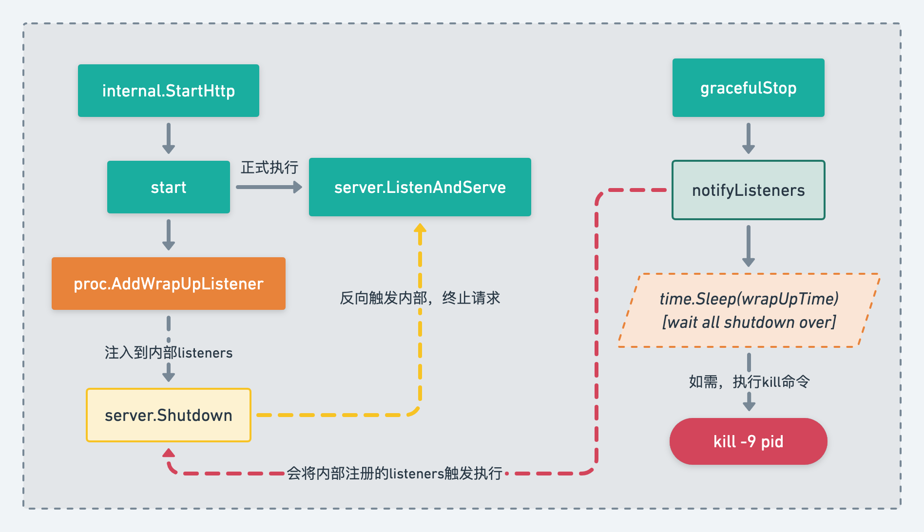 wrap up,关闭目前服务请求,以及资源time.Sleep(),等待资源处理完成,以后关闭完成shutdown,通知退出- 如果主goroutine还没有退出,则主动发送 SIGKILL 退出进程