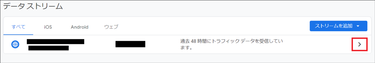 アナリティクスの基本的な設定を済ませていれば、データストリームが表示されているはずです。設定を行いたいサイトを選択してください。(画面ではストリーム(サイト)は1つしか登録していないので、1つしかありません。)