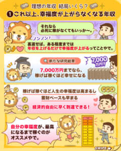 ちなみにアメリカでは、「1人当たりの年収75,000ドル」が幸福度の上がりにくいラインになっているそうです。(1ドル140円換算で約1,000万円)