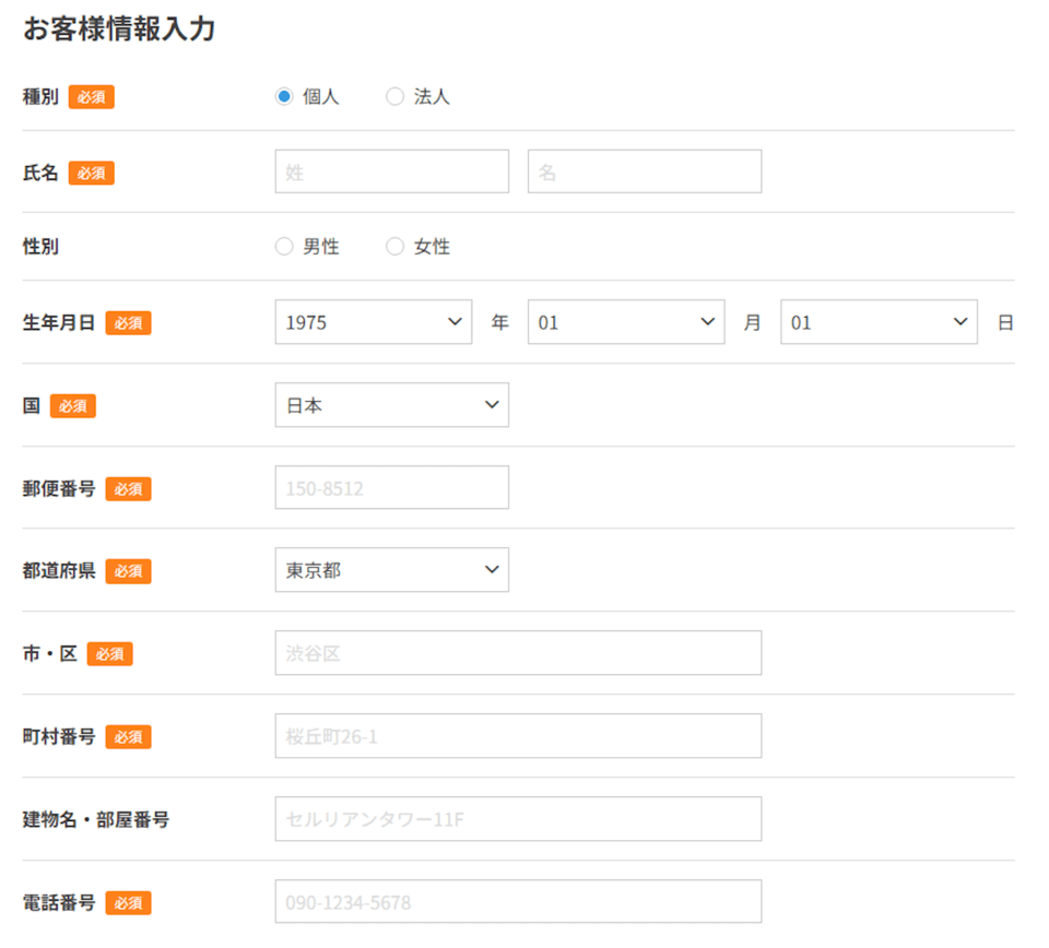 次に「お客様情報入力」の部分で、氏名・生年月日・住所など契約に必要な個人情報を入力します。