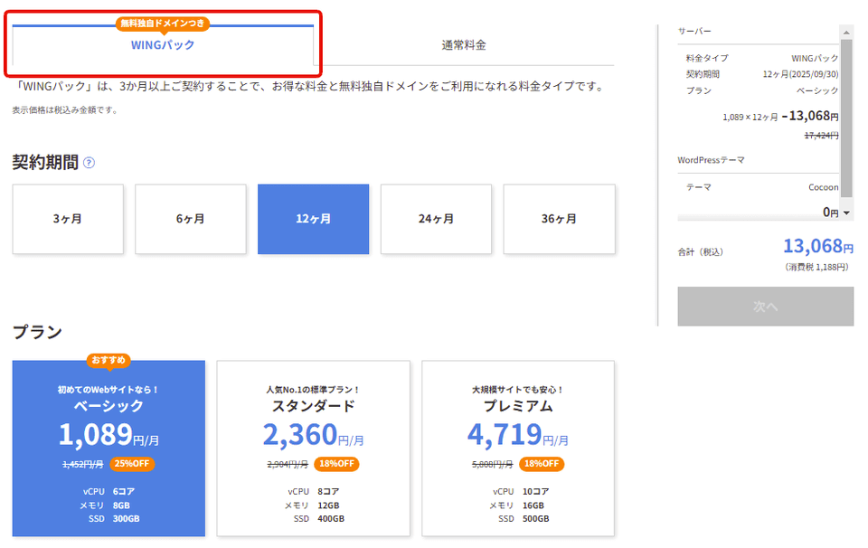 初心者さんなら「WINGパックのベーシックプラン(1年契約)」で十分です。