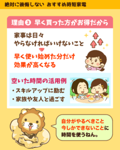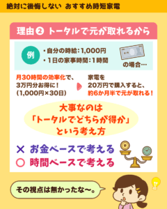 仮に時短家電の購入に20万円かかっても、月に3万円も得するのであれば6か月半で元が取れる計算になります。
