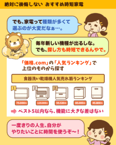 リベ大おすすめの時短家電を紹介できたら良いのですが、毎年のように新しい機種が販売されるため、「これが一番おすすめ!」と言いにくいのが現状です。