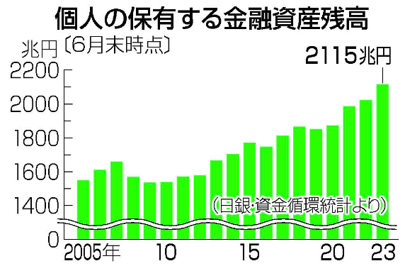 ニュース⑦:家計の金融資産2115兆円、最高を大幅更新