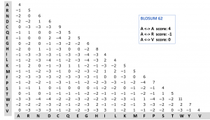 Aus diesem Grund verwenden Bioinformatikprogramme, die Sequenzen vergleichen, eine „Substitutionsmatrix“, um den Alignment-Score zu berechnen, wie z. B. die BLOSUM62-Matrix.