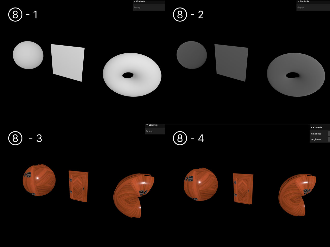 // 8-1. 初期値 const material = new THREE.MeshStandardMaterial() // 8-2 半透明に変更 material.transparent = true // 8-3 ドアのテクスチャの設定 material.metalness = 1 material.roughness = 1 material.map = doorColorTexture material.aoMap = doorAmbientOcclusionTexture material.aoMapIntensity = 1 // 8-4 より立体的に見せる設定 material.displacementMap = doorHeightTexture material.displacementScale = 0.1 material.metalnessMap = doorMetalnessTexture material.roughnessMap = doorRoughnessTexture material.normalMap = doorNormalTexture material.normalScale.set(0.5, 0.5) material.alphaMap = doorAlphaTexture scene.add(material)