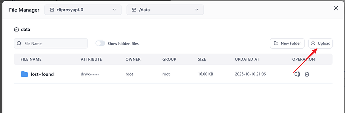 点击右上角的 Upload,选择刚才准备好的 config.yaml 文件并上传
