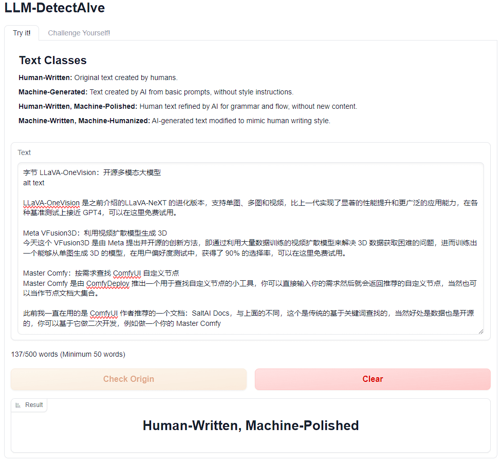 我拿昨天童叟无欺的人类创作的日报内容试了下,检测结果是“人工创作,机器润色”,我觉得也算合理,毕竟我也用到了大模型来帮我快速读论文/技术报告。