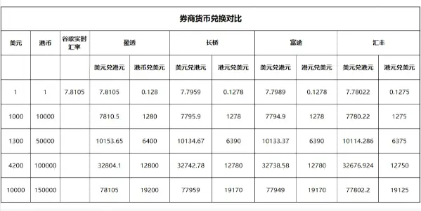 盈透、长桥、富途、汇丰都可以进行货币兑换,除了盈透每笔兑换收2美金手续费外,另外三家都不收费,但是兑换汇率不一样,价差不一样,我在同一时间看了各家的兑换汇率,做了个对比表。