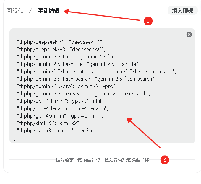 然后到模型重定向,点击手动编辑,复制ai生成的json文本粘贴进去