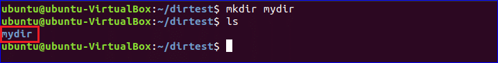 Suppose, you want to create a directory in /home folder named ‘mydir’. Run the following command to create the directory. If no directory exists with the name ‘mydir’ before then the command will be executed without any error. Run ‘ls’ command to check the directory is created or not.
