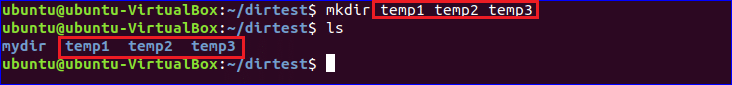 Run the following command to create multiple directories using ‘mkdir’ command. Three directories, temp1, temp2 and temp3 will be created after executing the command.