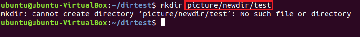 Suppose, you want to create a directory in a path, /picture/newdir/test. In the current system, ‘mydir’ directory has no directory or files in it. So, the path is invalid. Run the ‘mkdir’ command with the above path. An error message will appear after running the command.