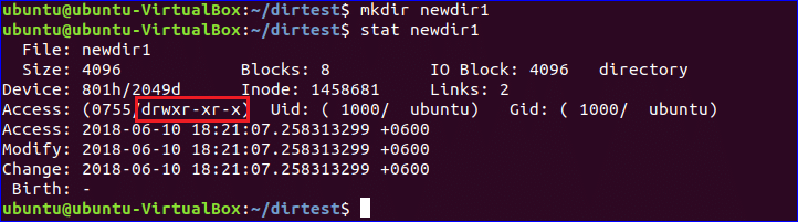 Create a new directory and check the default permission by executing following commands. ‘stat’ command is used to check current permission of any existing directory. The default directory permission is ‘rwxr-xr-x’. This indicates directory owner has all permissions, and group users and others users have no write permission.