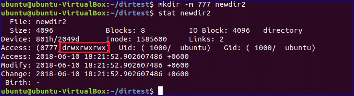 ‘-m’ option is used to set the directory permission at the time of directory creation. Run the following commands to create a directory with all permissions and check the permission using ‘stat’ command. The output shows all types of users have all permissions.