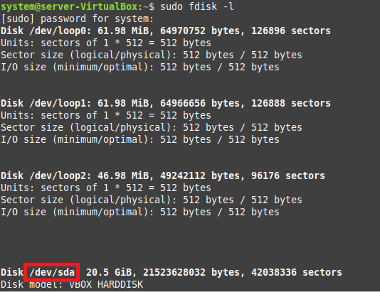 All the partitions of your Linux Mint system will appear on the terminal after executing this command. From here, you can easily pick one partition for checking errors. In our case, we have chosen the “/dev/sda” partition as highlighted below: