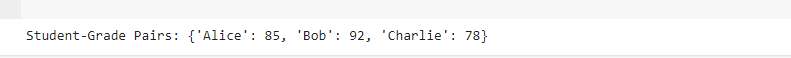 In this example, the zip() function pairs the student names from the “students” list with their corresponding grades from the “grades” list which results in a dictionary where each student is associated with their respective grade.