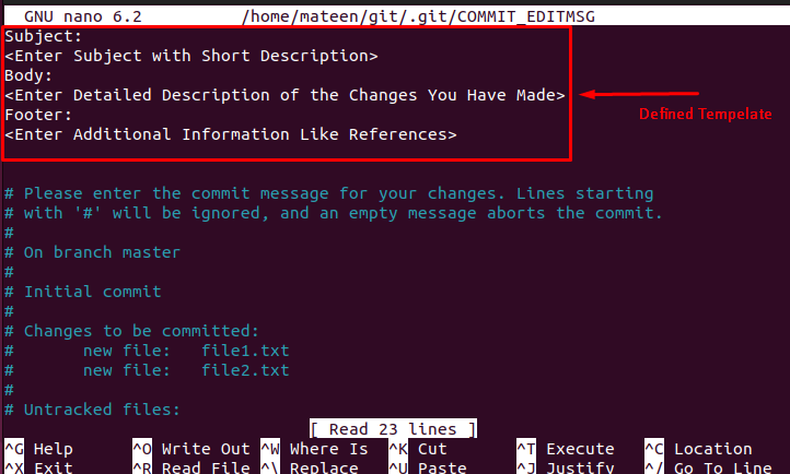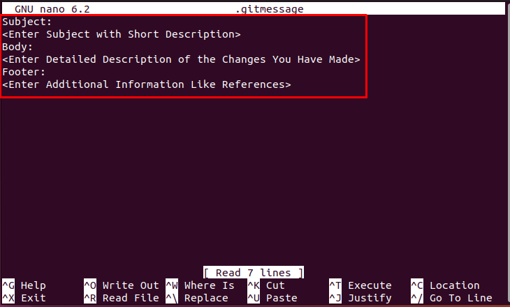 After creating the “.gitmessage” file, open it with the nano editor and define the commit message template. For instance, we have added the 3 portions, subject, body, and footer. You can define the template as per your needs and preferences: