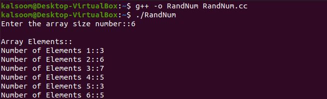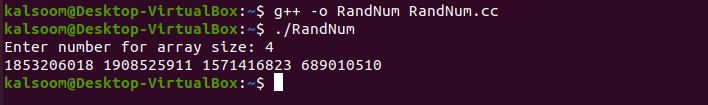 The outcome of the random number of array size “4” is displayed on the terminal screen of Ubuntu.