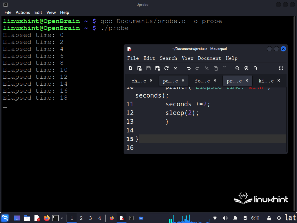 In the following, we will see a picture with the compilation and execution of this code. As we can see, every 2 seconds, the program prints the elapsed seconds on the screen since the execution of the process.
