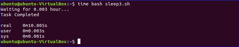 In the following script, ‘h‘ is used as the suffix with sleep command. Here, the time value is 0.003 hour. After waiting 0.003 hour “Task completed” should be printed on the screen but it requires more times in reality when ‘h’ suffix is used.