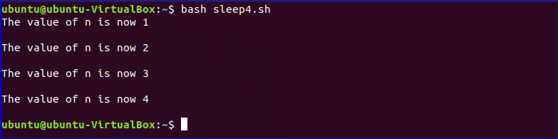 You can use sleep command for various purposes. In the following example, sleep command is used with while loop. Initially, the value of the variable n is set to 1 and the value of n will be incremented by 1 for 4 times in every 2 seconds interval. So, when will you run the script, each output will appear after waiting 2 seconds.