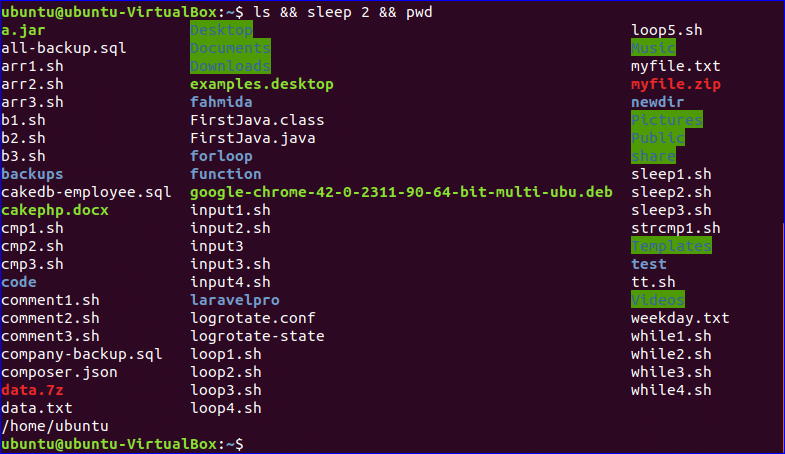 Suppose, you want to run multiple commands and set the fixed time interval between the outputs of two commands, then you can use sleep command to do that task. In this example, the command ls and pwd are with sleep command. After executing the command, ls command will show the directory list of the current directory and show the current working directory path after waiting for 2 seconds.