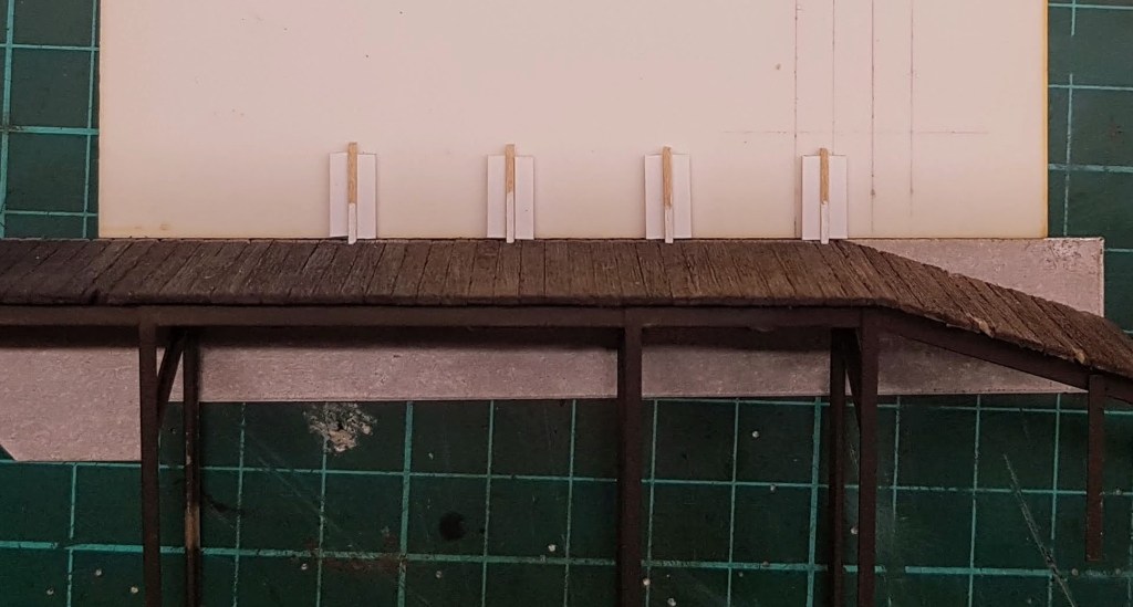 To get the correct spacing for the posts, I laid the platform on its side with the posts in place and glued small styrene blocks in the appropriate locations.
