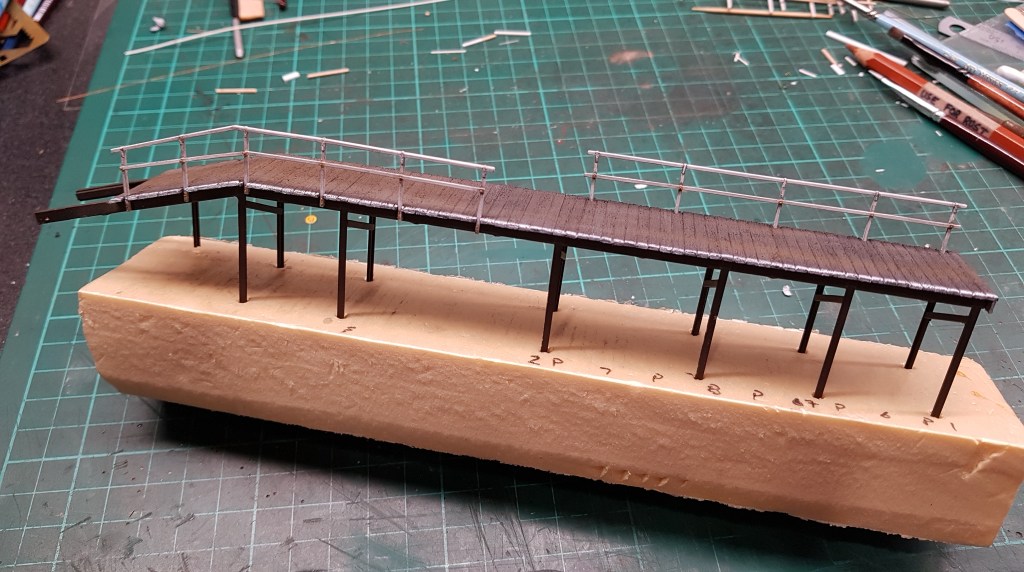 To enable the fitting and cutting to length of the angled handrail, both it and the other rail side one were temporarily fitted to the platform and held in place with some Blu-tak.