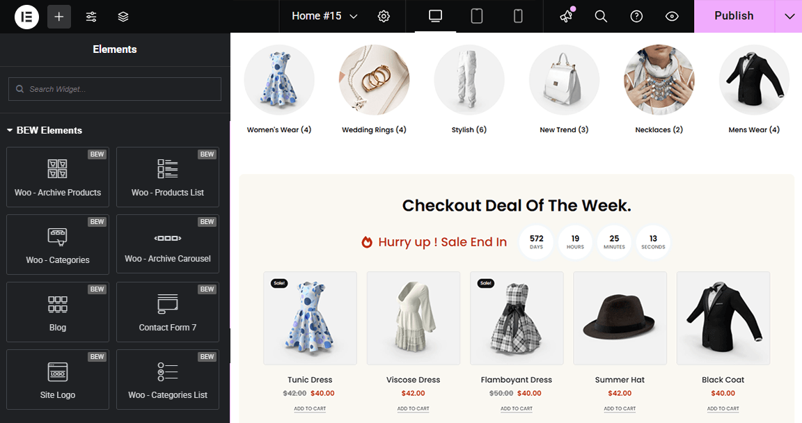 All our WooCommerce Elementor Widgets are available in Elementor builder under “BEW ELEMENTS”.