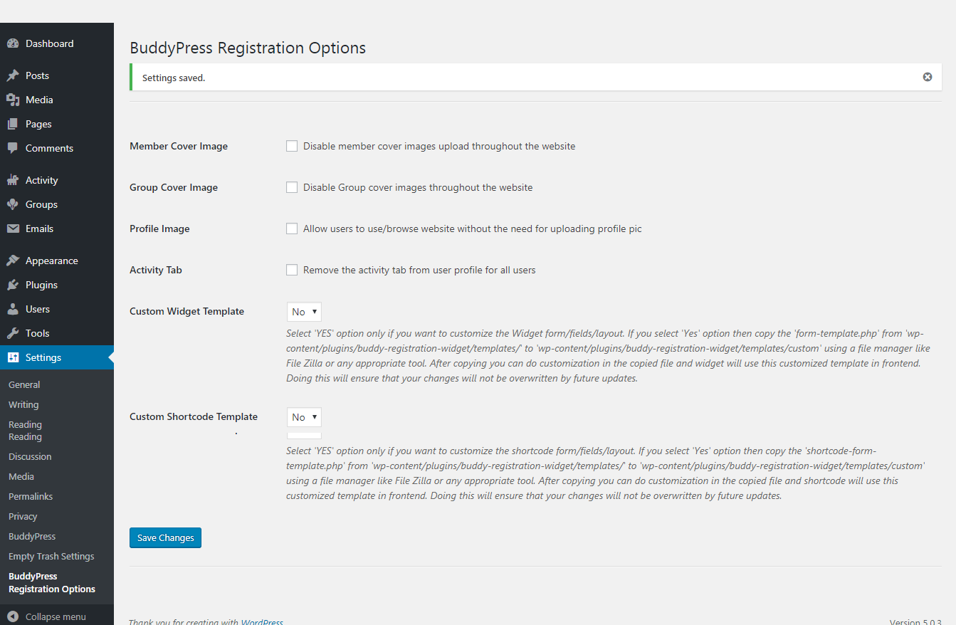 This plugin provides BuddyPress registration form as a widget with many other configurable option. Using this plugin the website administrator can disable member cover image, group cover image. Administrator can also allow the users to browse the website without the need for uploading a profile picture. Activity tab can also be removed from the user profile. The most important feature added is to allow the administrator use custom templates to display the registration form and it is done in such way that future plugin updates will not affect the customizations done.