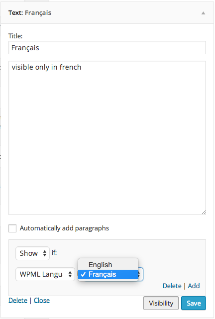 The Jetpack visibility module is appended to the bottom of all widgets (including 3rd parties). This plugin adds any active WPML language options to the list so you can have widgets appear for specific languages. For example, show french translated text widget, or a french twitter account for the French translation of your website.