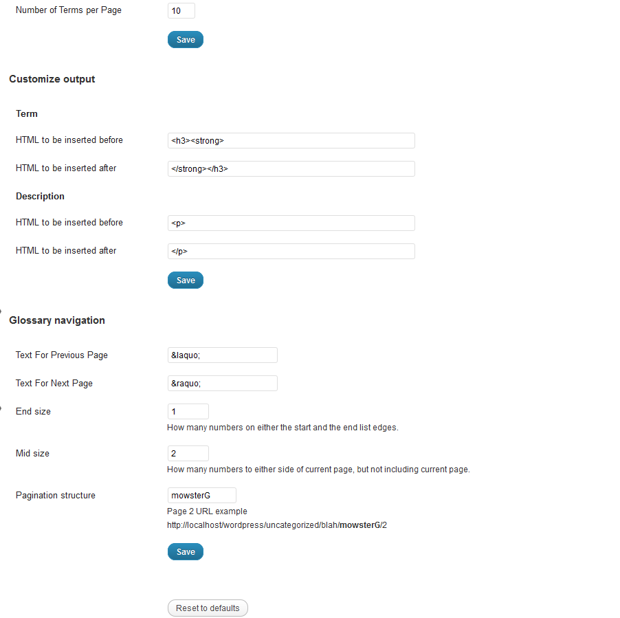 • Number of terms to be displayed per page