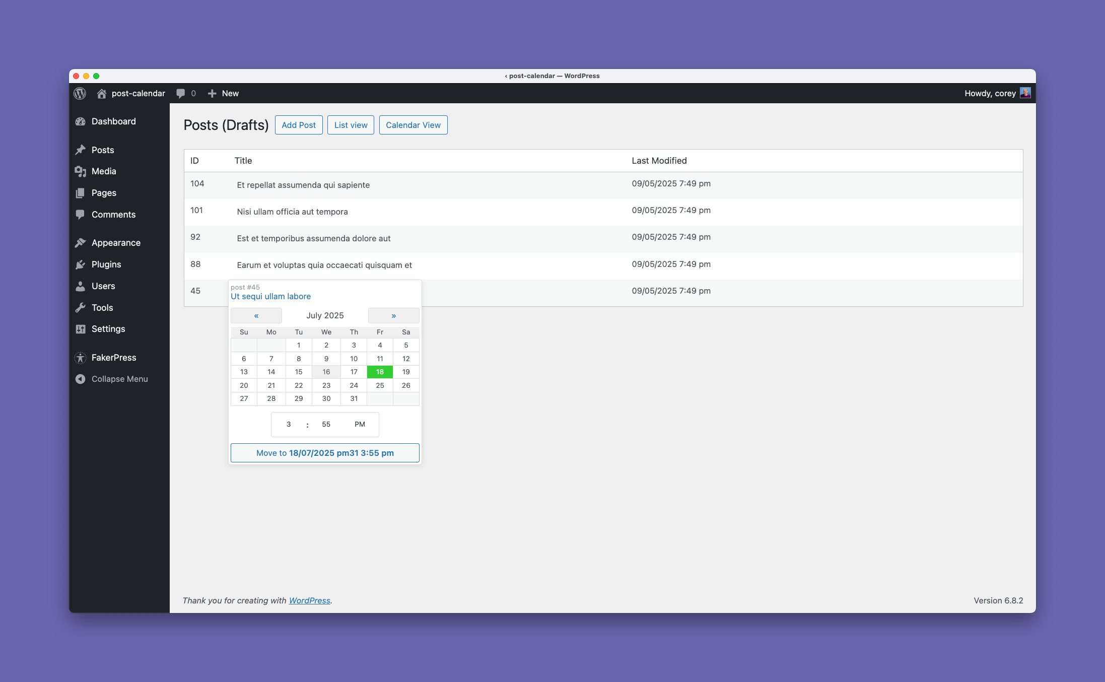 Post Calendar adds a beautiful calendar view to your WordPress admin area, allowing you to see all your posts organized by publication date. You can easily reschedule posts by clicking on them and selecting a new date and time.