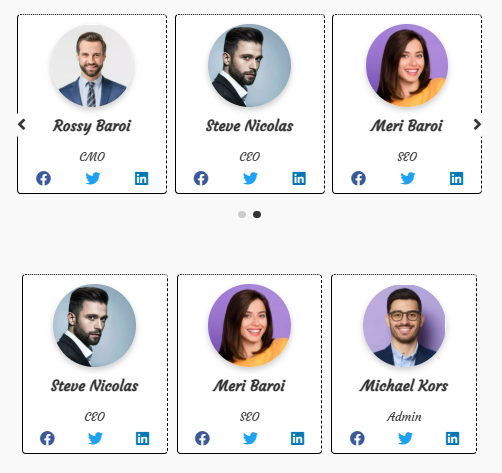 • Carousel or Slider Layout: Showcase team members in an interactive carousel slider.