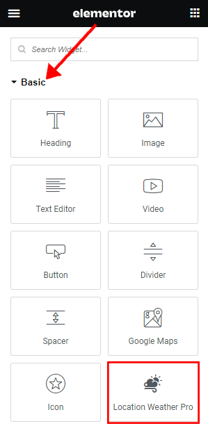 - Look to the left sidebar. In the Basic widgets section, you should see a widget labeled Location Weather.