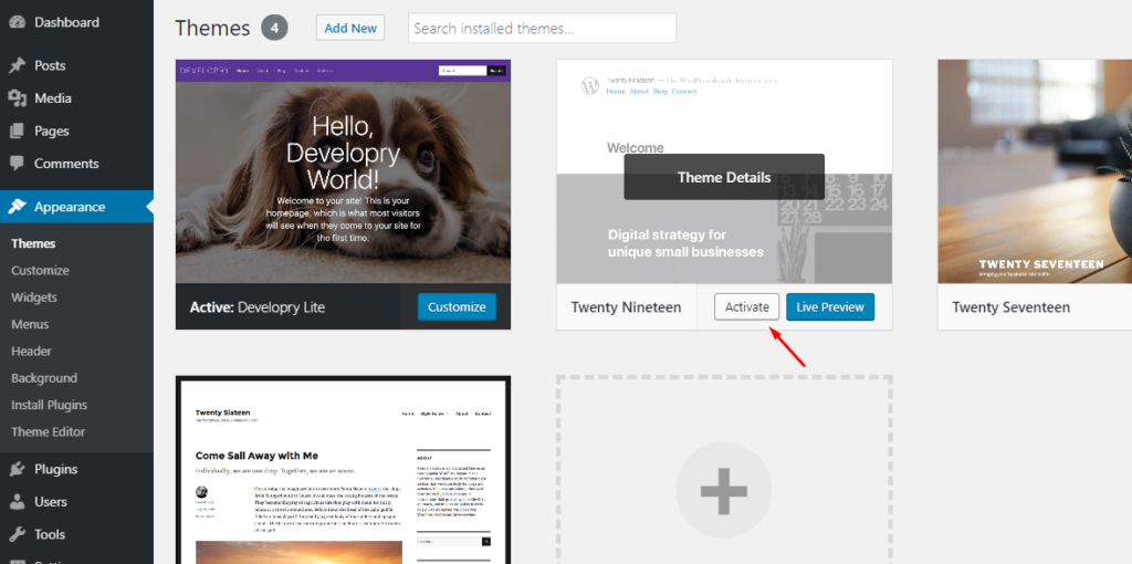 This will disable the existing theme and WordPress will replace it with the default theme.
