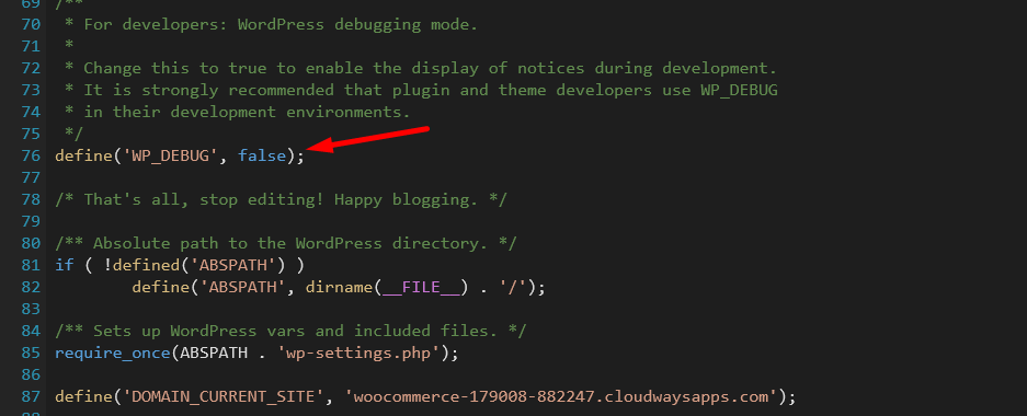 define (‘WP_DEBUG’, false)