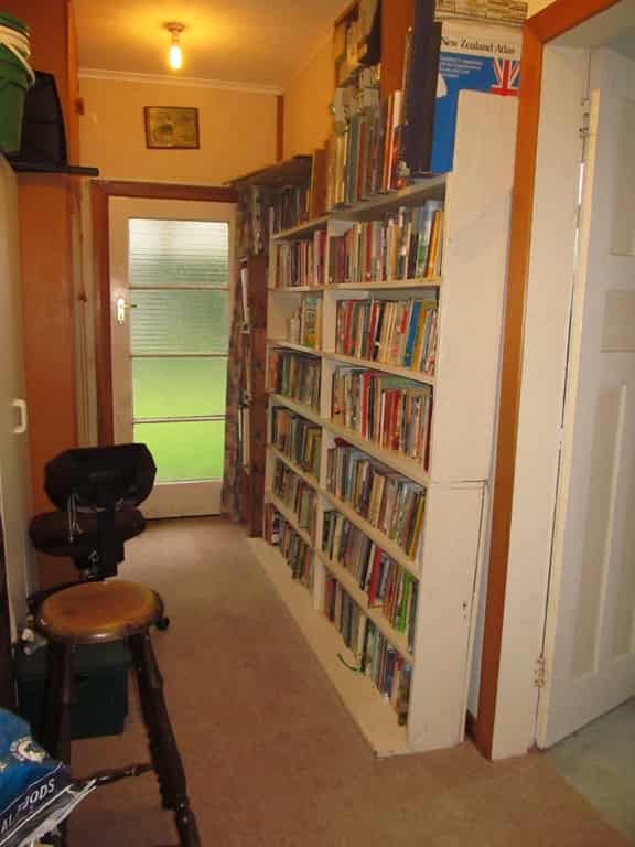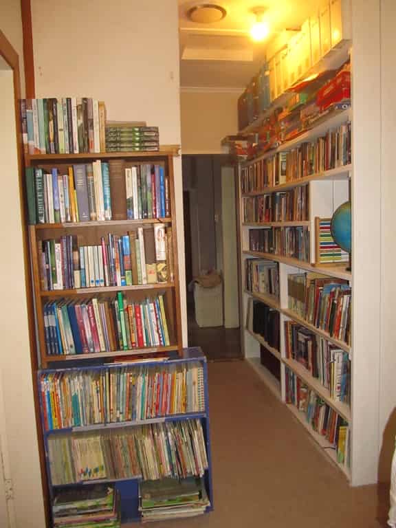 Edit 25 August 2024: Since that paragraph was written, we have expanded the library more. As you can see in this post, we now have shelves all around the hallway. We have added labels on the spines of the books to make it easier to keep them organized, and at the moment we have over 3,400 books in our collection!