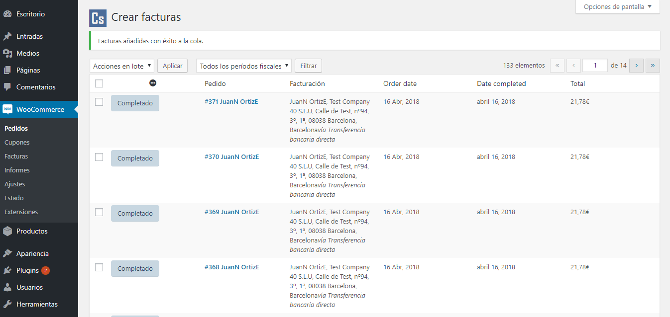 Once the plugin has been successfully configured, every order that changes its state to ‘Completed’ will be queued to be automatically sent to Contasimple. The process might be triggered by many different means, for example, when an order is paid via a payment gateway, like Redsys, or when you manually mark an order as completed in the back-office, once you have verified a payment via bank transfer.