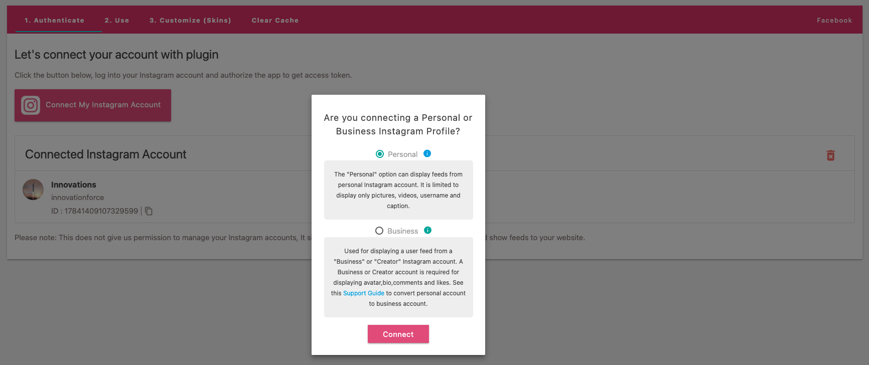 For Business Advanced connections, Facebook requires Instagram Business accounts to be connected to a Facebook Page. This is a Meta/Facebook requirement, not a plugin limitation. This connection enables advanced features like hashtag feeds and better API access.