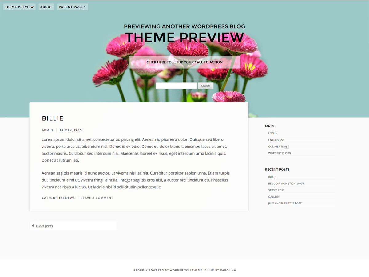 Billie is a responsive, accessible blog theme. The theme has two optional menus (including a social menu), several different sidebars and a footer widget area that will hold any number of widgets. The theme is compatible with the new block editor, and also includes a Call To Action button and two page sections that you can combine with your front page. I recommend that you install the Jetpack plugin to make full use of supported features like featured content, contact forms, testimonials, social sharing and more. To create a portfolio, install Jetpack and create your projects, all the templates are already shipped with the theme. Billie also works well with WooCommerce.