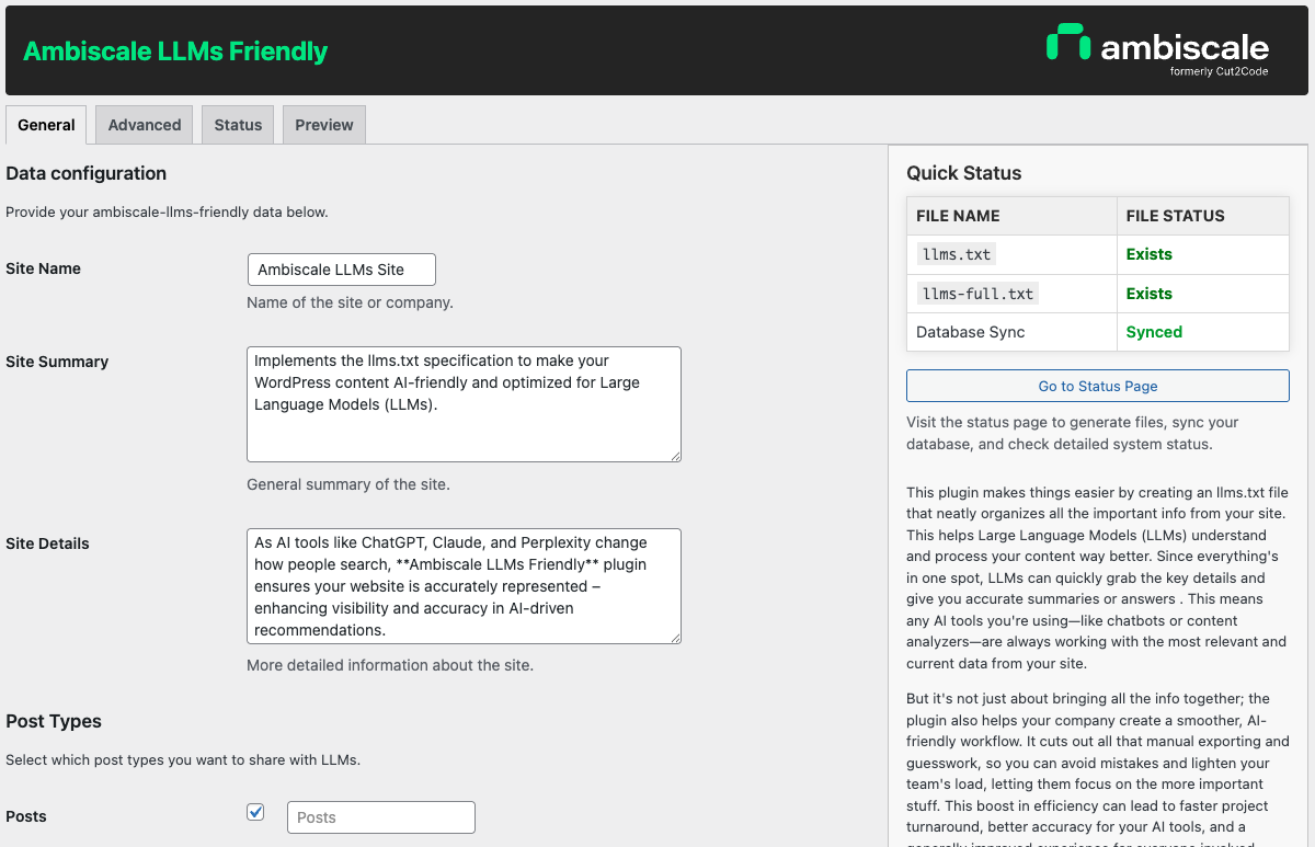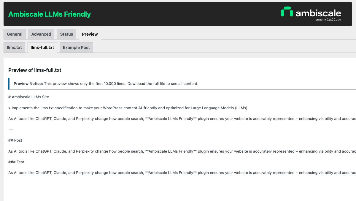 With AI tools playing a growing role in content discovery and analysis, websites need a reliable, standardized way to communicate with large language models. Our plugin takes care of this automatically – generating structured, LLM-friendly text files that help AI systems accurately interpret and present your WordPress content.