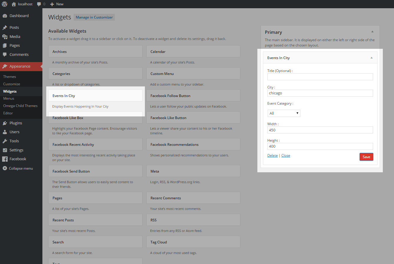 - You can see ‘Events In City’ and ‘Events by Organizer’ widgets in appearance -> widgets -> Events In City/Events by Organizer.