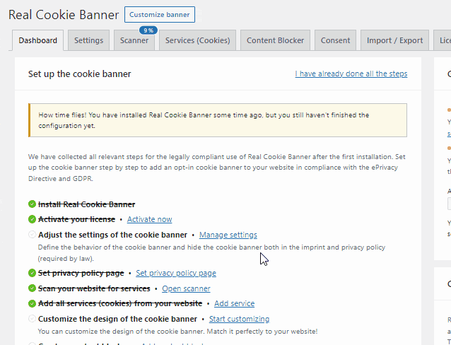Guided configuration: After installation, the checklist will guide you through all steps to be able to set up Real Cookie Banner in a legally compliant manner. We also explain the legalities of features and the legal consequences if you change settings. So, you can quickly and safely set up your cookie banner!