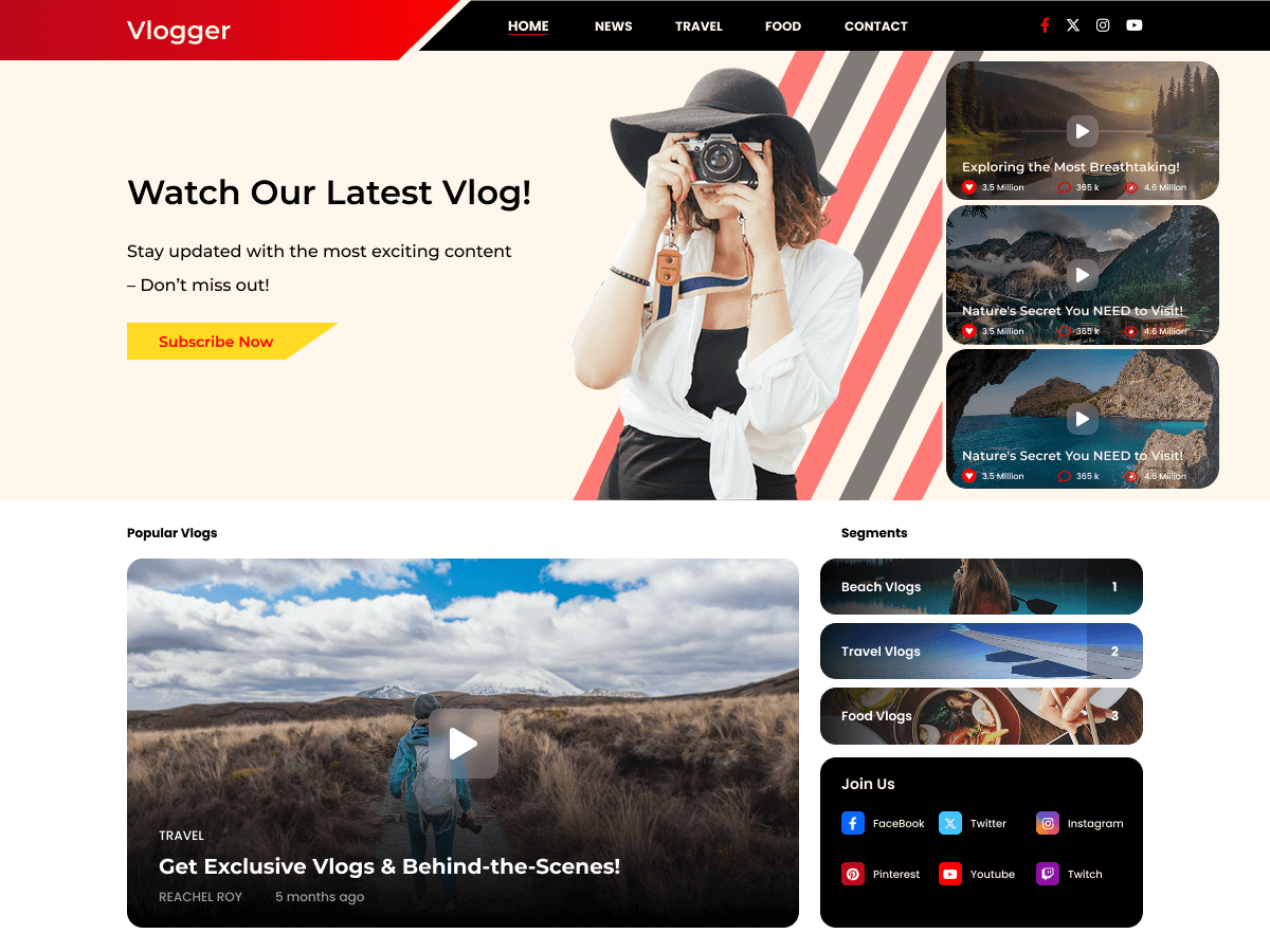 Professional Vlogger is a modern and engaging theme designed for creators who want to build a standout online presence through video content. Ideal for YouTubers, lifestyle vloggers, travel vloggers, tech reviewers, fashion vloggers, fitness vloggers, food vloggers, gaming creators, and daily vlog channels, this theme helps showcase videos, tutorials, reviews, behind-the-scenes clips, and storytelling content in a visually captivating layout. Its streamlined structure includes customizable sections for featured videos, playlists, creator introductions, collaborations, and audience testimonials, making it easy to present your brand and content style effectively. The responsive design ensures flawless video playback across all devices, while optimized layouts enhance viewer engagement and watch time. With options to highlight gear recommendations, vlogging tips, social media links, and branding elements, the theme gives creators the flexibility to build a professional identity. Integrated with Contact Form 7 for collaborations and inquiries, Professional Vlogger provides a strong platform for growing your audience, showcasing creative work, and establishing credibility in the competitive world of digital content creation. https://preview.wpradiant.net/professional-vlogger/