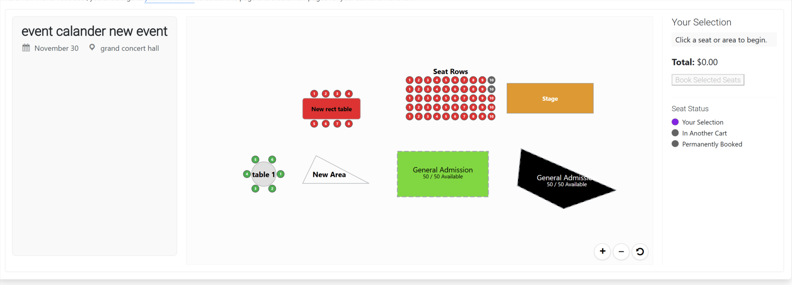- Theater & Row-Based Seating: Not just for dinners! Create blocks of seats with configurable rows and seats-per-row, perfect for theaters, lecture halls, and auditoriums. The orphan seat rule is automatically disabled for these blocks to allow for natural single-ticket purchases.