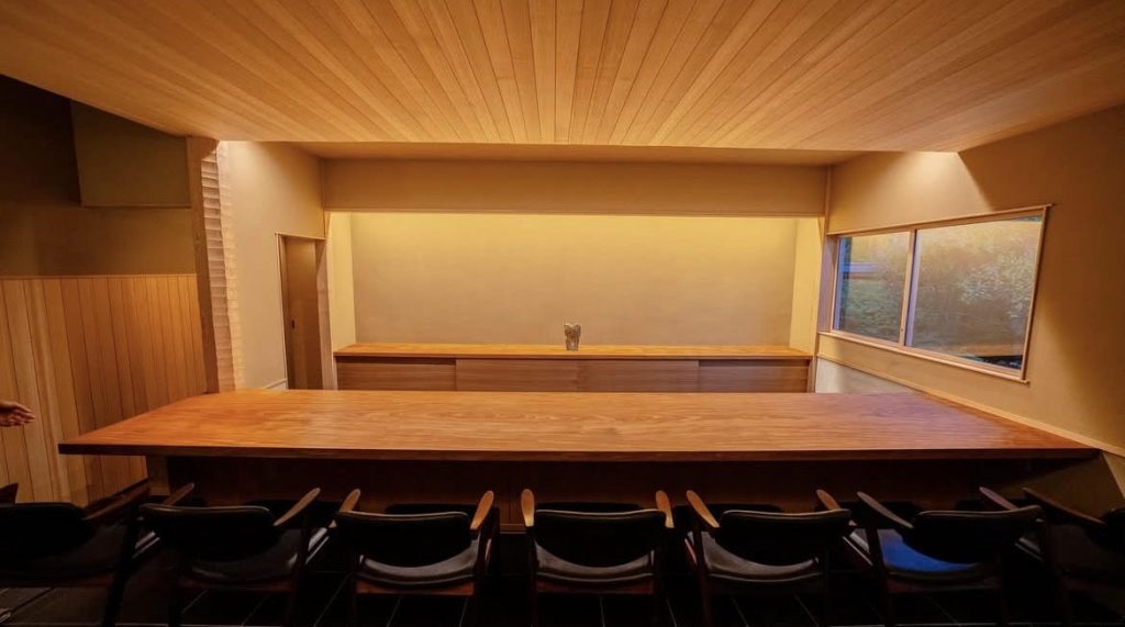 今回は、鎌倉らしいワインサロンを作りたいと同店をオープン。店舗は和素材を用いたモダンな空間づくりに定評のある京都の建築家・木島 徹氏が手掛けています。木の温もりを感じる店内は、凛とした空気が流れる静謐な雰囲気。無駄なものを排除したすっきりした内装で、窓からは緑を眺められ柔らかな光が差し込みます。客席はカウンターに7席の他、6名まで利用できる半個室を完備。喧騒から離れ、非日常を感じることができます。