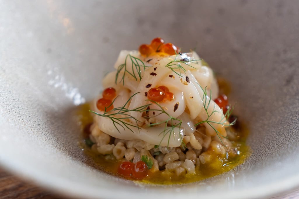 コース料理の前菜「白織」は、ブルグルという大麦を出汁で炊き、その上に魚醤とハーブのオイルでマリネしたイカとイクラをのせたもの。自家製ピクルスとパプリカを発酵させた黄色いソースで仕上げられている。イカや大麦の食感にいくらの旨みとソースの夏らしい酸味、ディルの清涼感が合わさった一皿。疲れた体にスッと染みわたるような味わいだった。